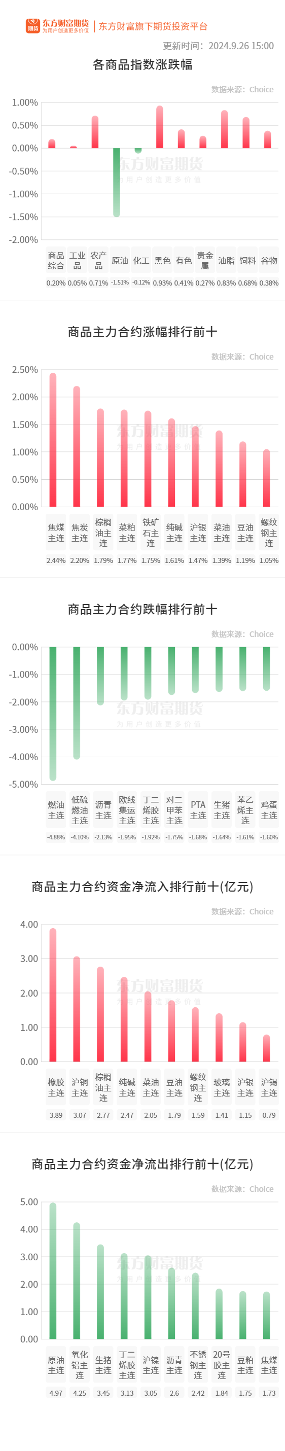 螺纹钢:据Mysteel,截至9月26日当周,螺纹钢产量连续第五周增加,厂库由增转降,社库连续第十二周减少,表需由降转增。①螺纹产量205.46万吨,较上周增加11.23万吨,增幅5.78%;②螺纹厂库128.13万吨,较上周减少15.81万吨,降幅10.98%;③螺纹社库287.33万吨,较上周减少34.19万吨,降幅10.63%;④螺纹表需255.46万吨,较上周增加33万吨,增幅14.86%。(Mysteel)