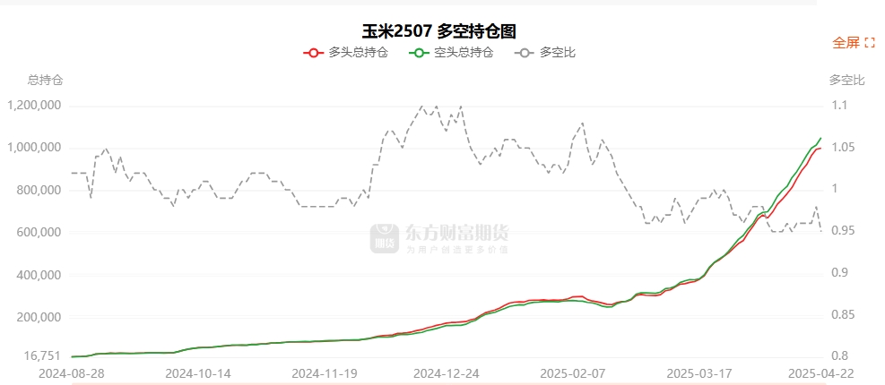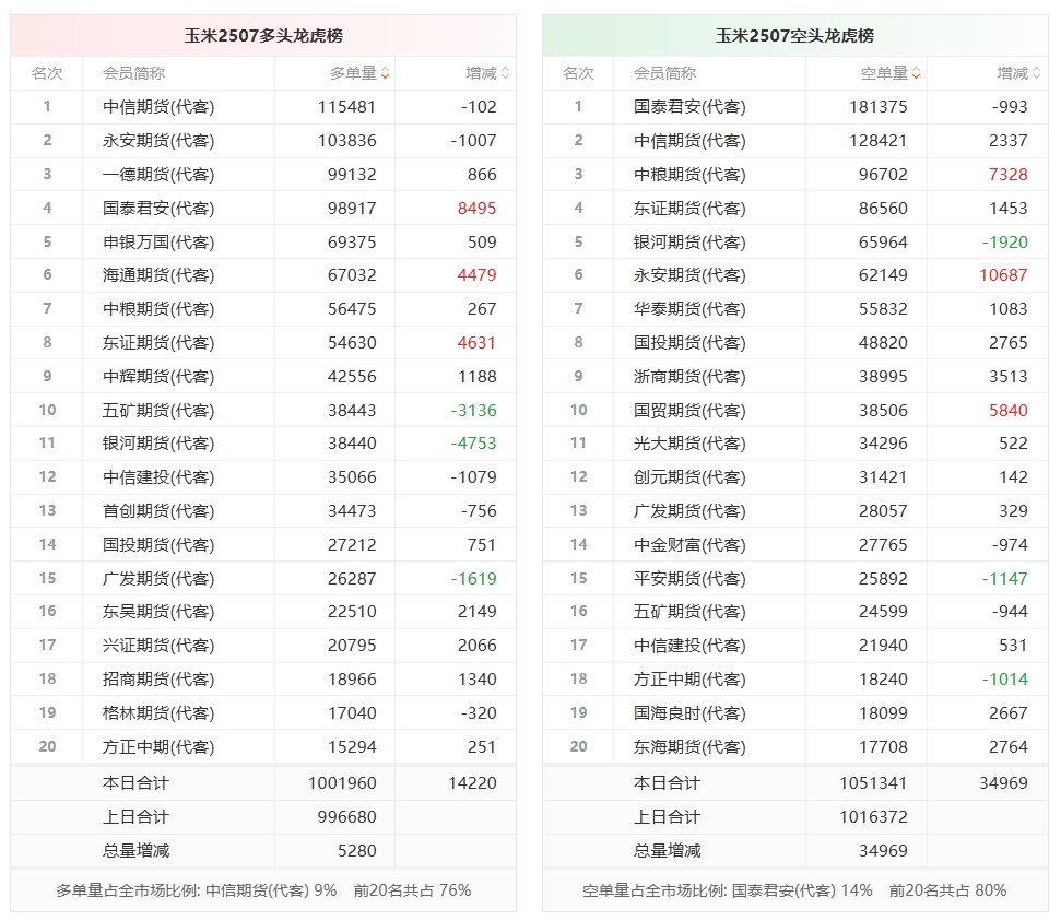 总体而言,玉米2507合约今日增仓上行,多空持仓排名前20席中,多空双方均呈进场态势,多头进场意愿弱于空头。