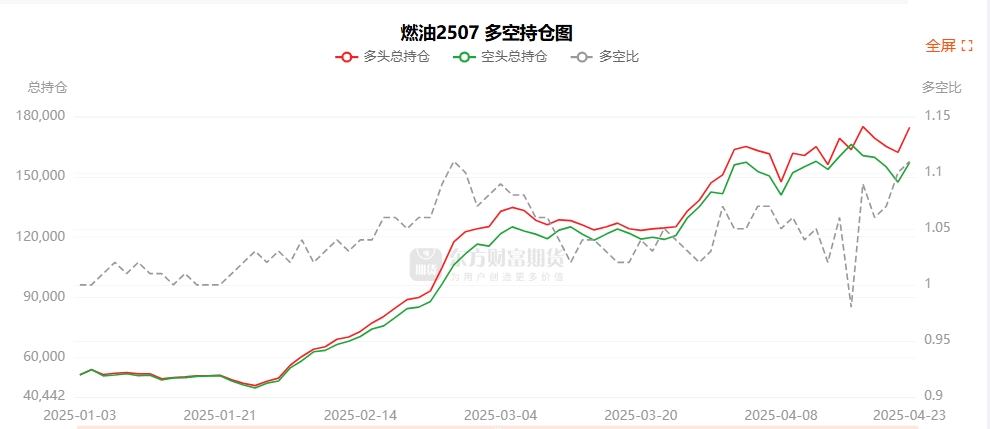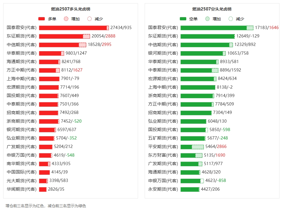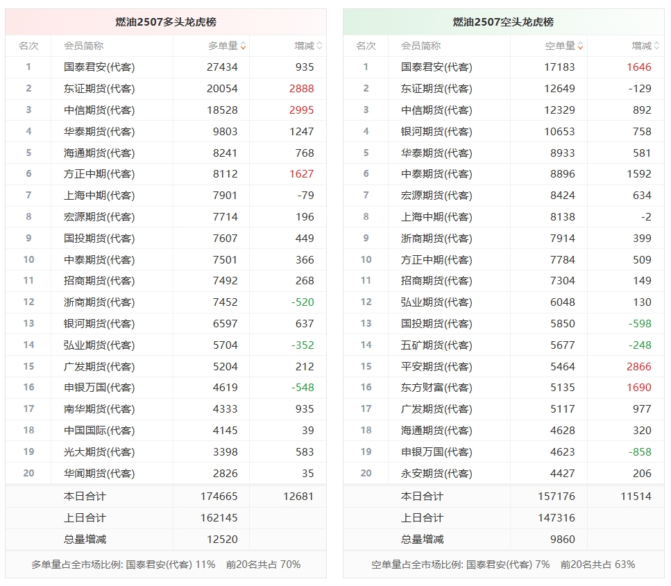 总体而言,燃油2507合约今日增仓上行,多空持仓排名前20席中,多空双方均呈进场态势,多头进场意愿强于空头。