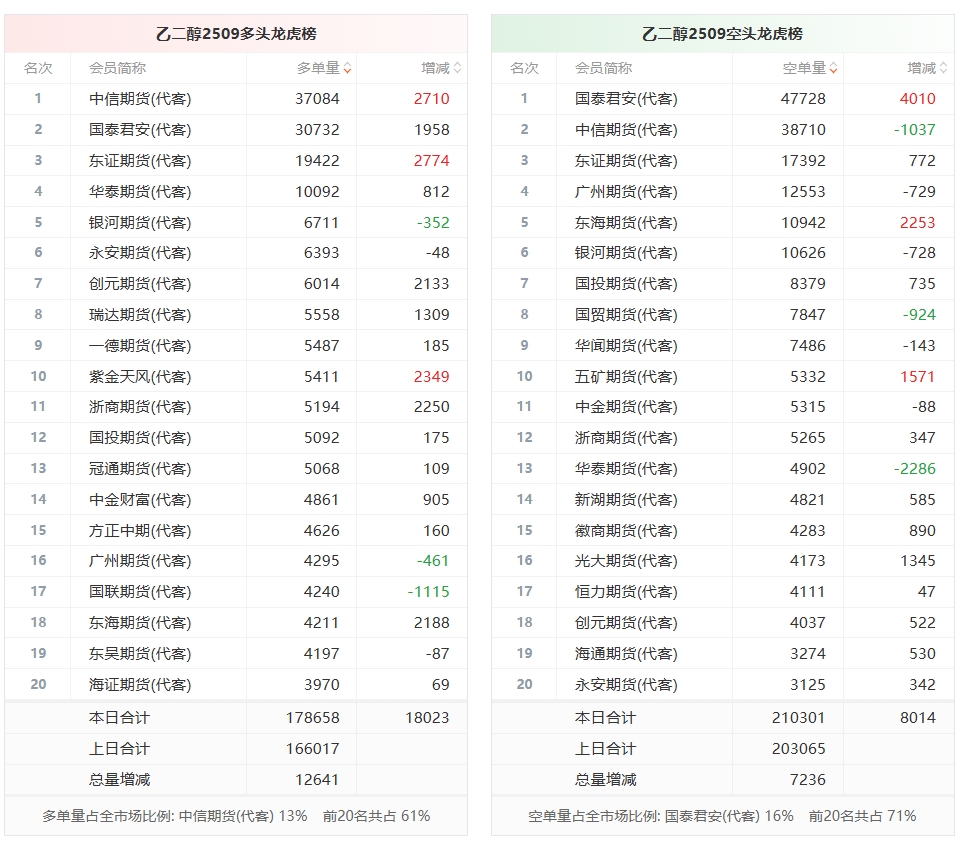 总体而言,乙二醇2509合约今日增仓上行,多空持仓排名前20席中,多空双方均呈进场态势,多头进场意愿强于空头。