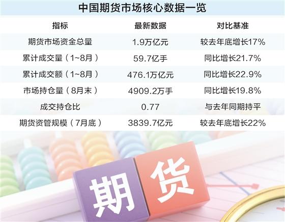 与资金规模同步扩张的,还有期市的成交与持仓。今年1~8月,全国期货市场(含期货交易所上市的期货和期权品种)累计成交量达到59.7亿手,累计成交额高达476.1万亿元,同比分别增长21.7%、22.9%。截至8月末,全国期货市场持仓量为4909.2万手,同比增长19.8%。