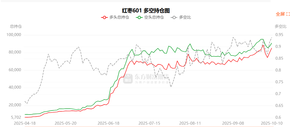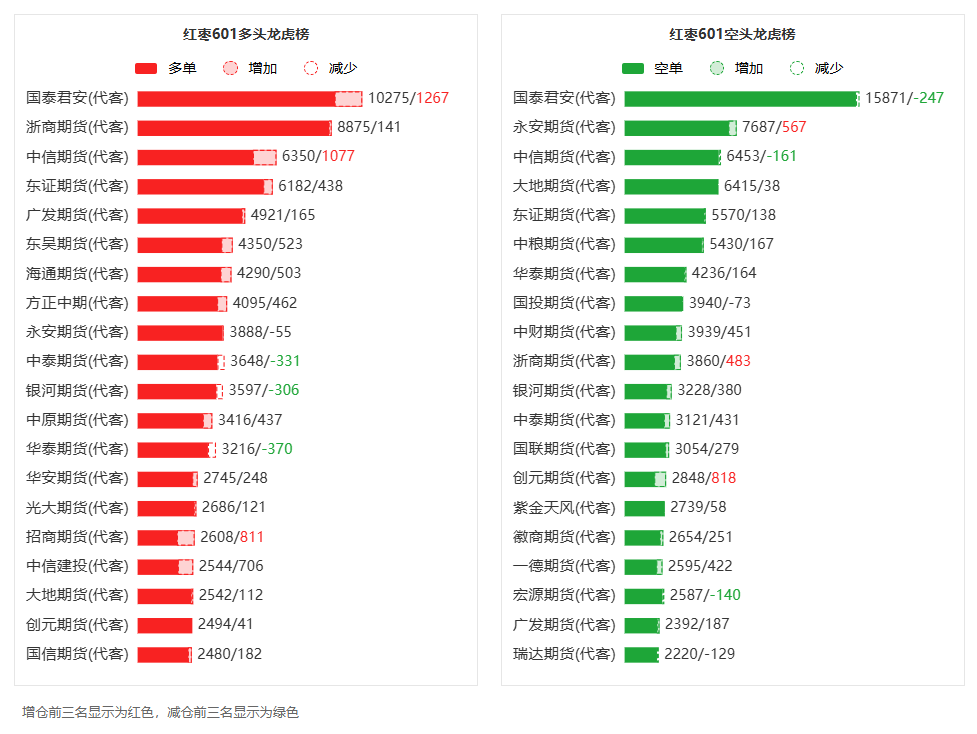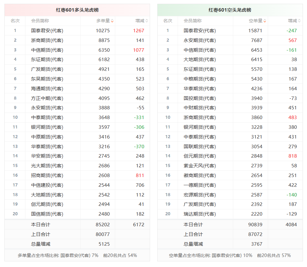 总体而言,红枣601合约今日增仓上行,多空持仓排名前20席中,多空双方均呈进场态势,多头进场意愿强于空头。
