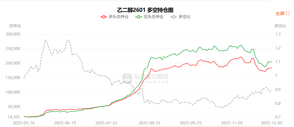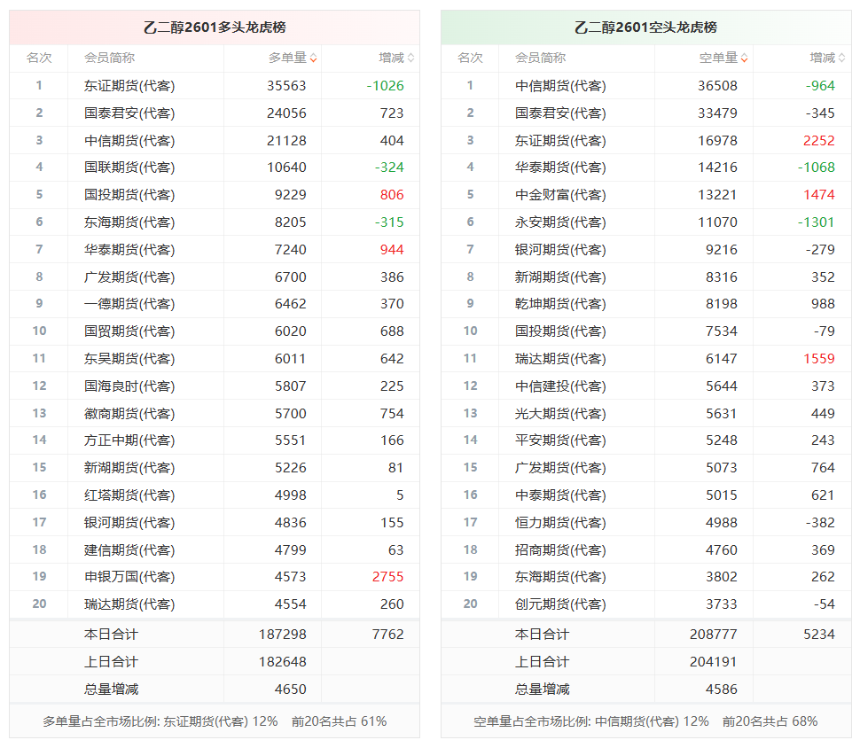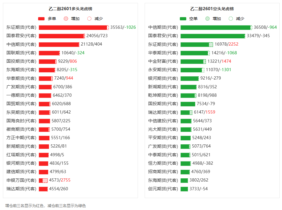 总体而言,乙二醇2601合约今日增仓下行,多空持仓排名前20席中,多空双方均呈进场态势,多头进场意愿强于空头。