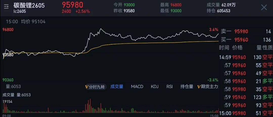 12月10日,碳酸锂期货震荡上行,主力合约LC2605报收于95980元/吨,上涨2.56%。
