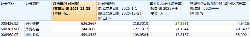 截至12月23日收盘,锡业股份、华锡有色和兴业银锡,年内涨幅分别达到103%、127%和218%。