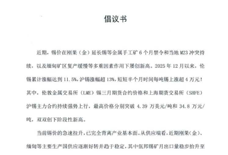 12月23日,中国有色金属工业协会锡业分会(下称“锡业分会”)的倡议书在业内广泛流传。
