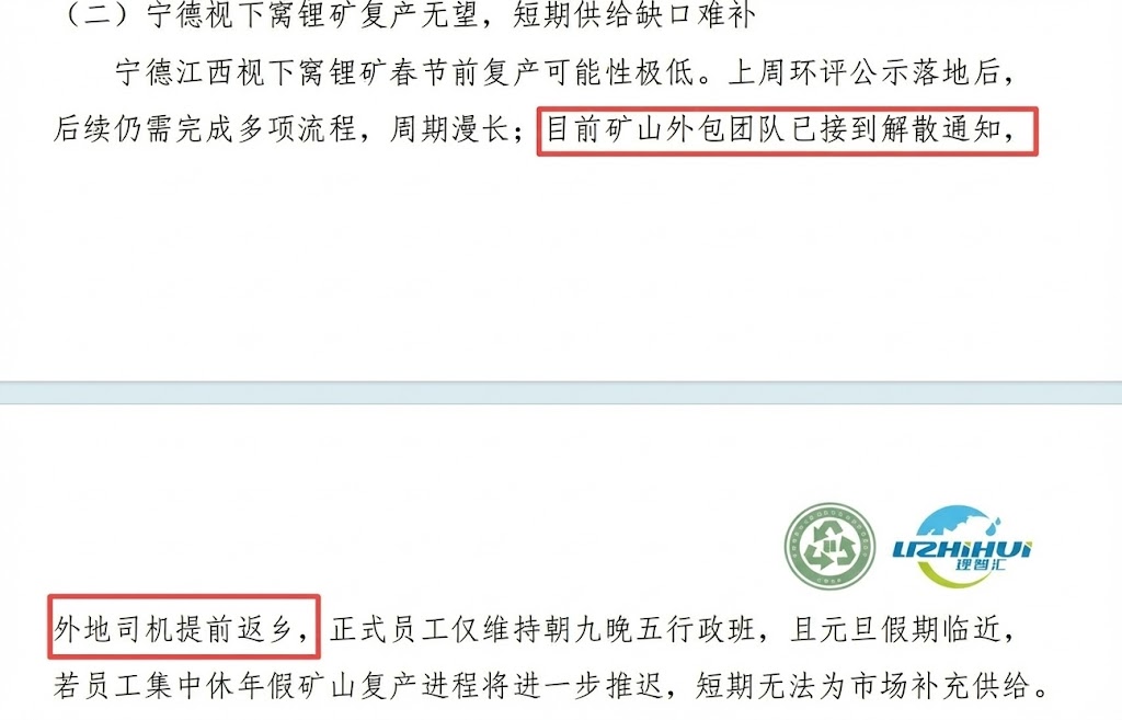 《财中社》独家获得的一份内部调研报告显示,宁德时代(300750/03750)江西宜春枧下窝锂矿在春节前实现复产的可能性极低。目前,矿山外包团队已接到解散通知。