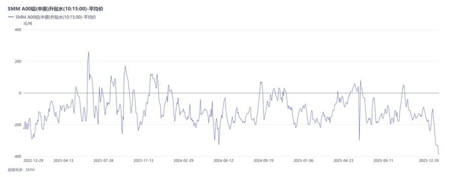 据SMM调研,洛阳、巩义地区环保管控力度持续加码,部分当地铝加工企业已全面停产,现货需求随之持续萎缩,预计于元旦假期结束后逐步恢复生产。与此同时,SMMA00中原对铝当月合约贴水扩大至390元/吨,创历史低位。