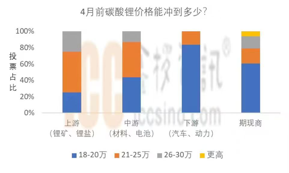 对此,期货日报记者向发布该调查样本的机构负责人了解到,该调查样本并非通过公开发放投票系统的方式来统计,而是通过私下一对一咨询锂矿、锂盐、材料厂、电池厂、汽车、动力等相关产业企业(调查样本没有个人投资者)的方式,询问企业对于“4月1日之前,碳酸锂期货价格看到哪里?”的看法;收集企业看法后,再统一汇总形成样本的调查结果。