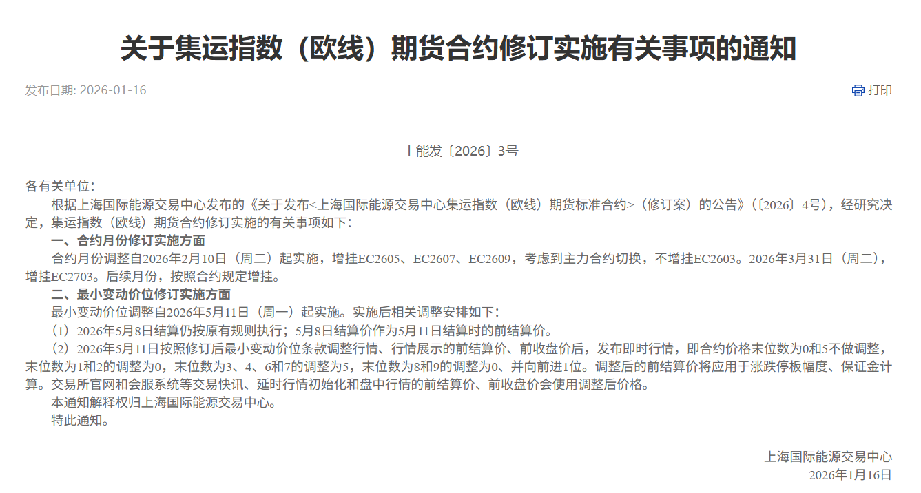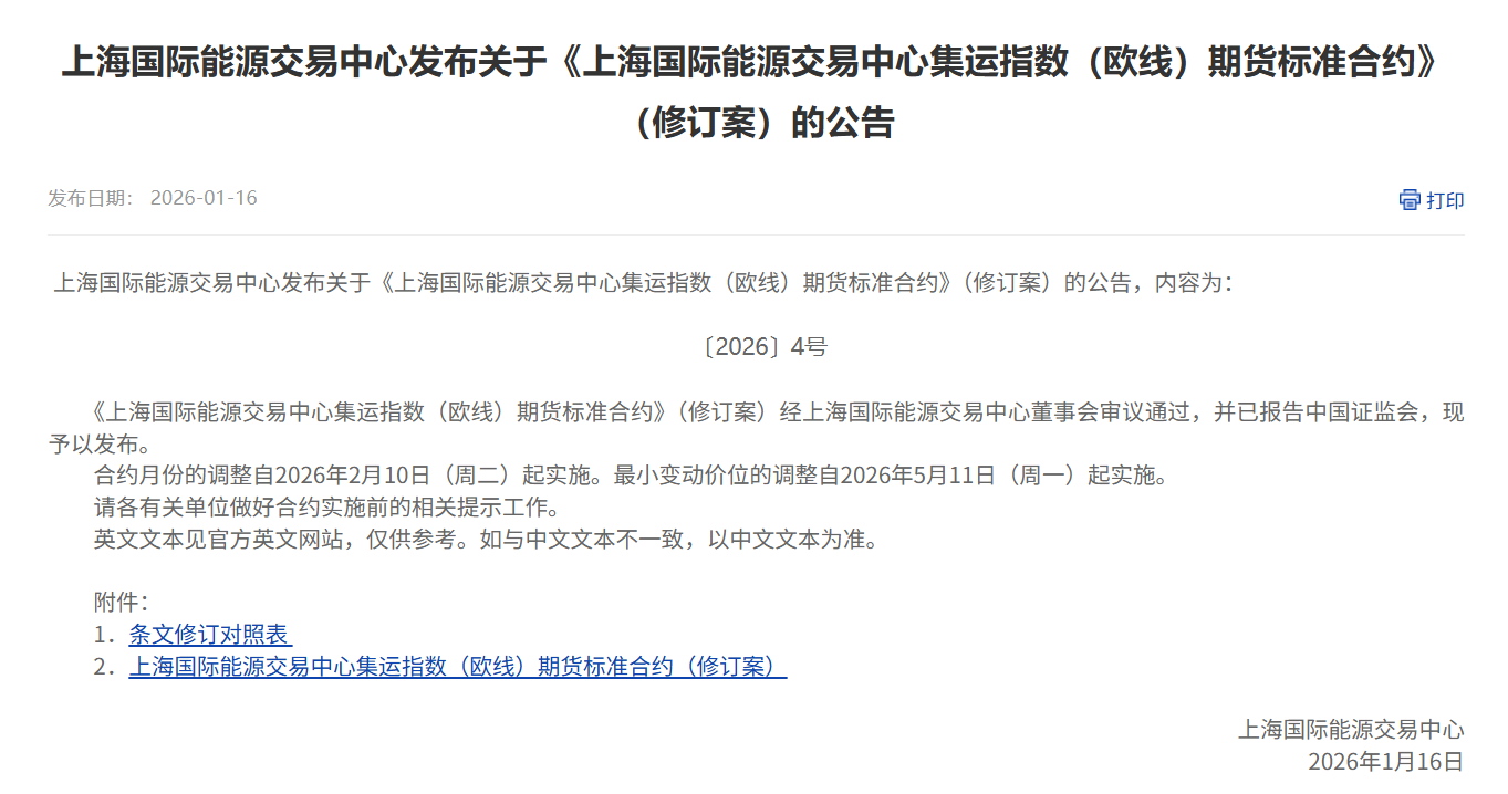 《上海国际能源交易中心集运指数(欧线)期货标准合约》(修订案)经上海国际能源交易中心董事会审议通过,并已报告中国证监会,现予以发布。 合约月份的调整自2026年2月10日(周二)起实施。最小变动价位的调整自2026年5月11日(周一)起实施。