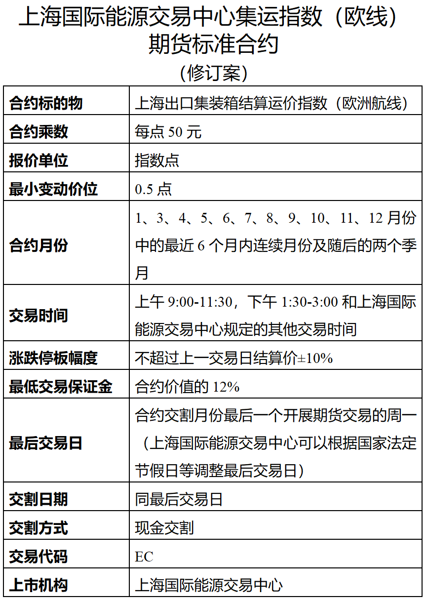 1月16日,上海国际能源交易中心发布公告,对集运指数(欧线)期货最小变动价位、合约月份条款进行了修订。