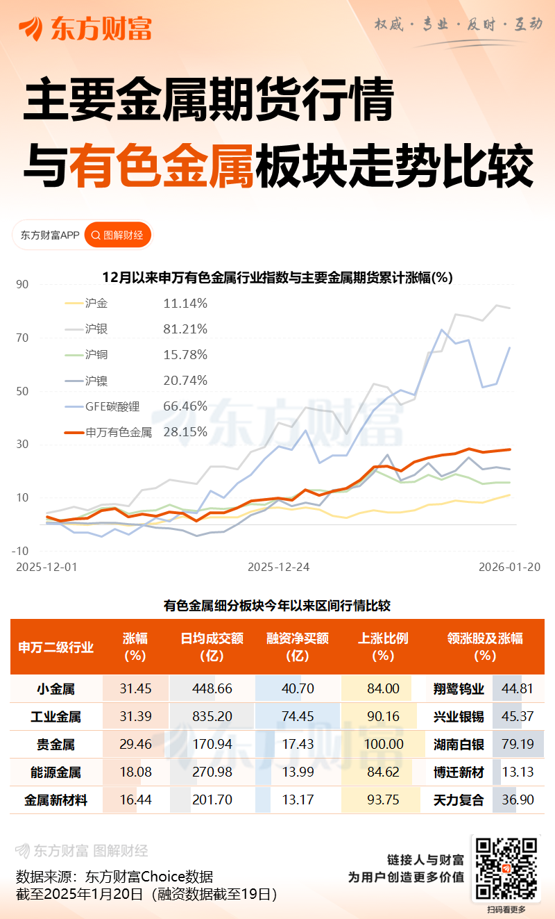 近期,有色金属、贵金属期货价格全面走强。截至1月20日,COMEX白银期货价格年内累计涨幅已超34%。国内市场,碳酸锂期货突破17万元/吨。年初至今,沪铝沪铜多次刷新历史新高,目前分别最高触及2.5万元/吨、10.56万元/吨。