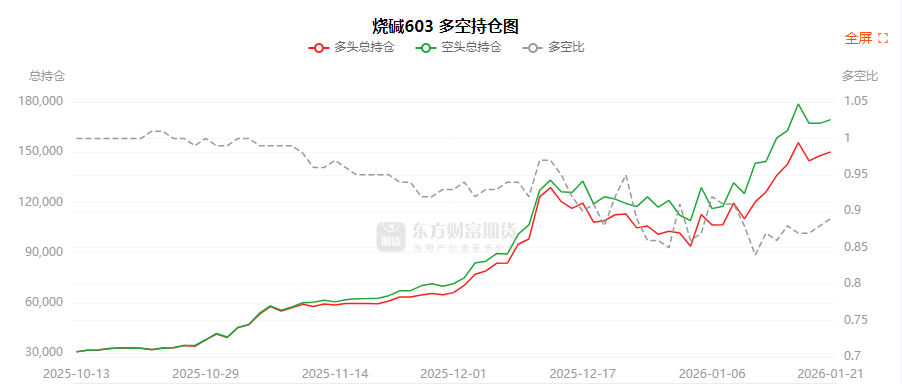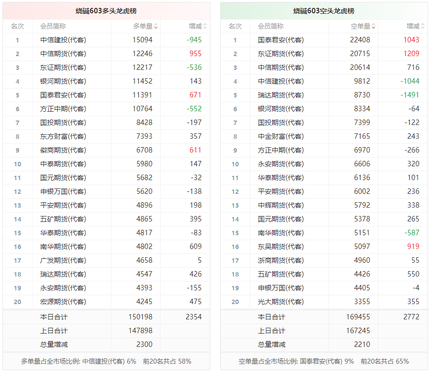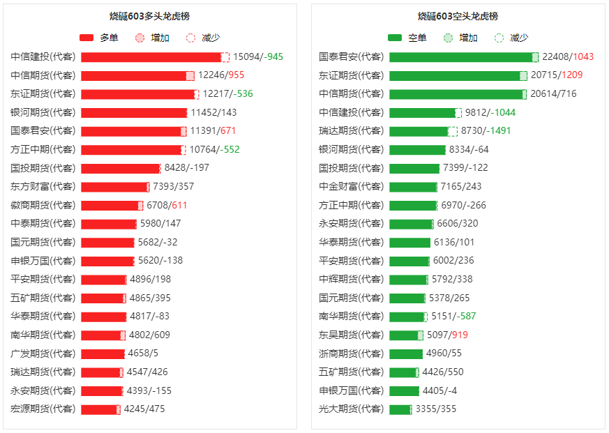 总体而言,烧碱603合约今日增仓下行,多空持仓排名前20席中,多空双方均呈进场态势,多头进场意愿强于空头。
