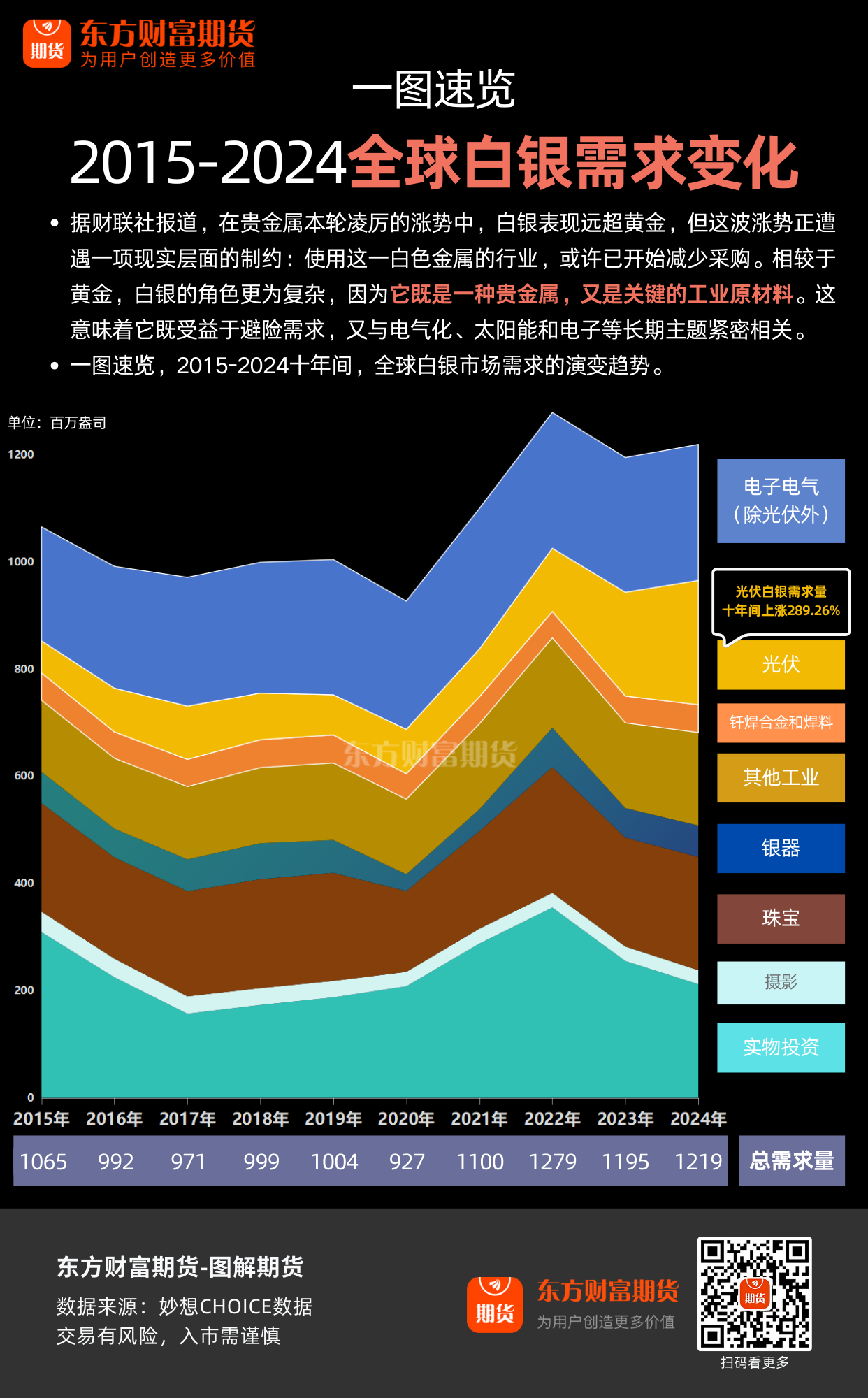 一图速览,2015-2024十年间,全球白银市场需求的演变趋势。