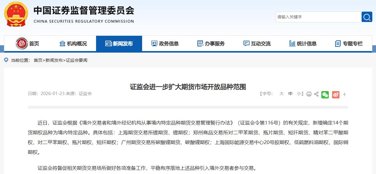 近日,证监会根据《境外交易者和境外经纪机构从事境内特定品种期货交易管理暂行办法》(证监会令第116号)的有关规定,新增确定14个期货期权品种为境内特定品种。具体包括:上海期货交易所镍期货、镍期权;郑州商品交易所对二甲苯期货、瓶片期货、短纤期货、精对苯二甲酸期权、对二甲苯期权、瓶片期权、短纤期权;广州期货交易所碳酸锂期货、碳酸锂期权;上海国际能源交易中心20号胶期权、低硫燃料油期权、国际铜期权。