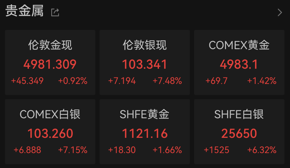 受地缘局势持续升温影响,贵金属上演史诗级大涨。周五(1月23日)纽约交易时段,现货黄金一度涨至4990美元,创历史新高,本周金价累涨超8%;现货白银单日大涨超7%,最高报约103美元/盎司,再创历史新高纪录,本月迄今已暴涨超40%。以期货即月合约收盘价计,金银齐创2020年来最大单周涨幅。