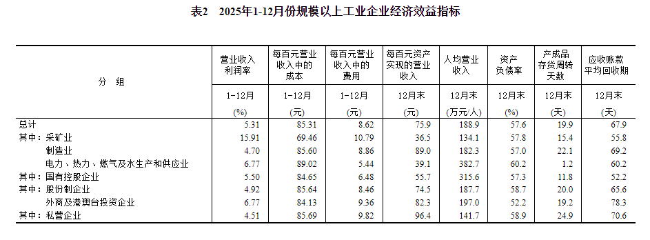 2025年末,规模以上工业企业每百元资产实现的营业收入为75.9元,比上年末减少2.7元;人均营业收入为188.9万元,比上年末增加5.5万元;产成品存货周转天数为19.9天,比上年末增加0.6天;应收账款平均回收期为67.9天,比上年末增加3.6天。