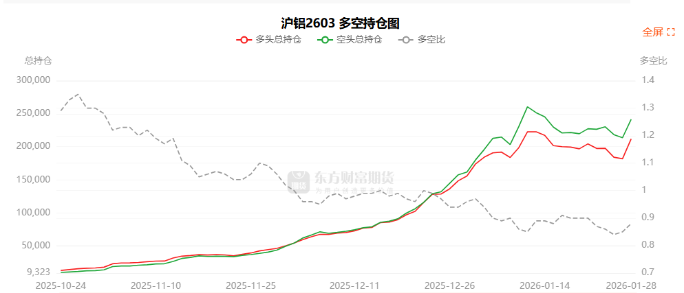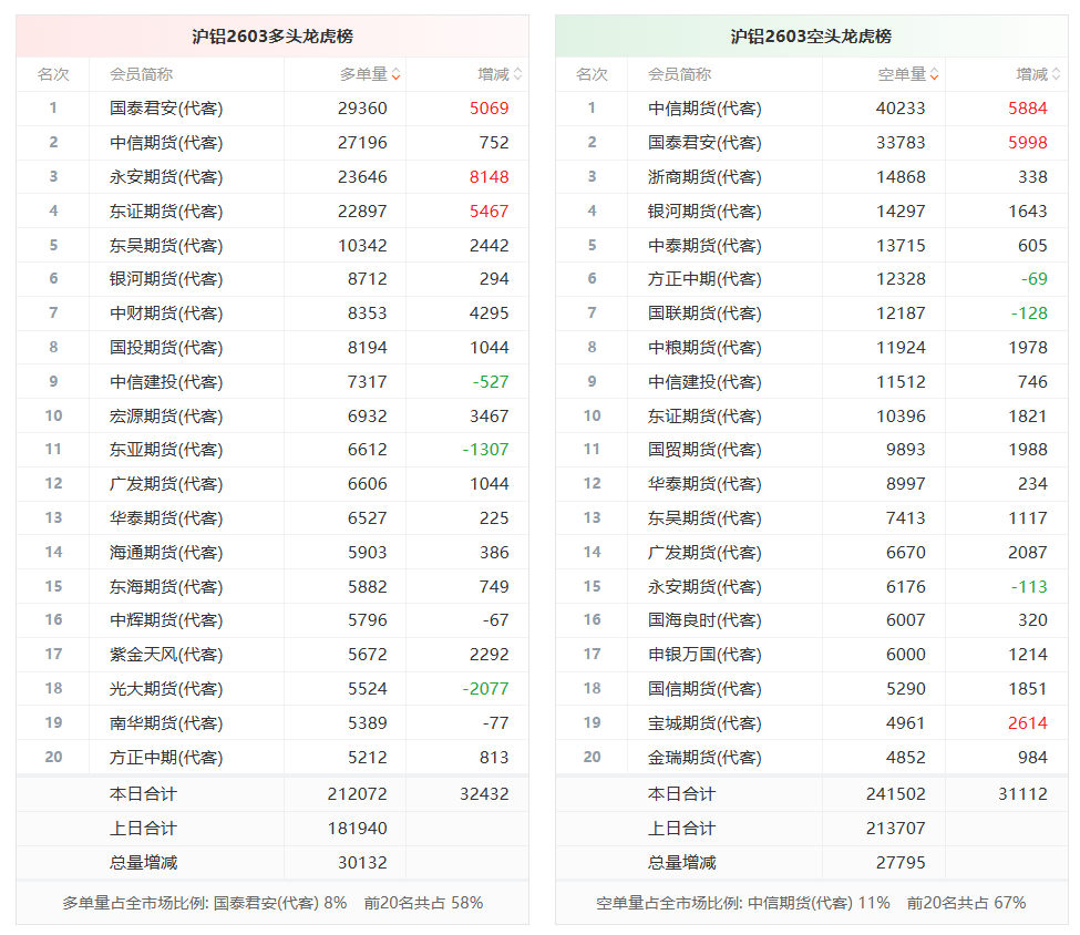 总体而言,沪铝2603合约今日增仓上行,多空持仓排名前20席中,多空双方均呈进场态势,多头进场意愿强于空头。