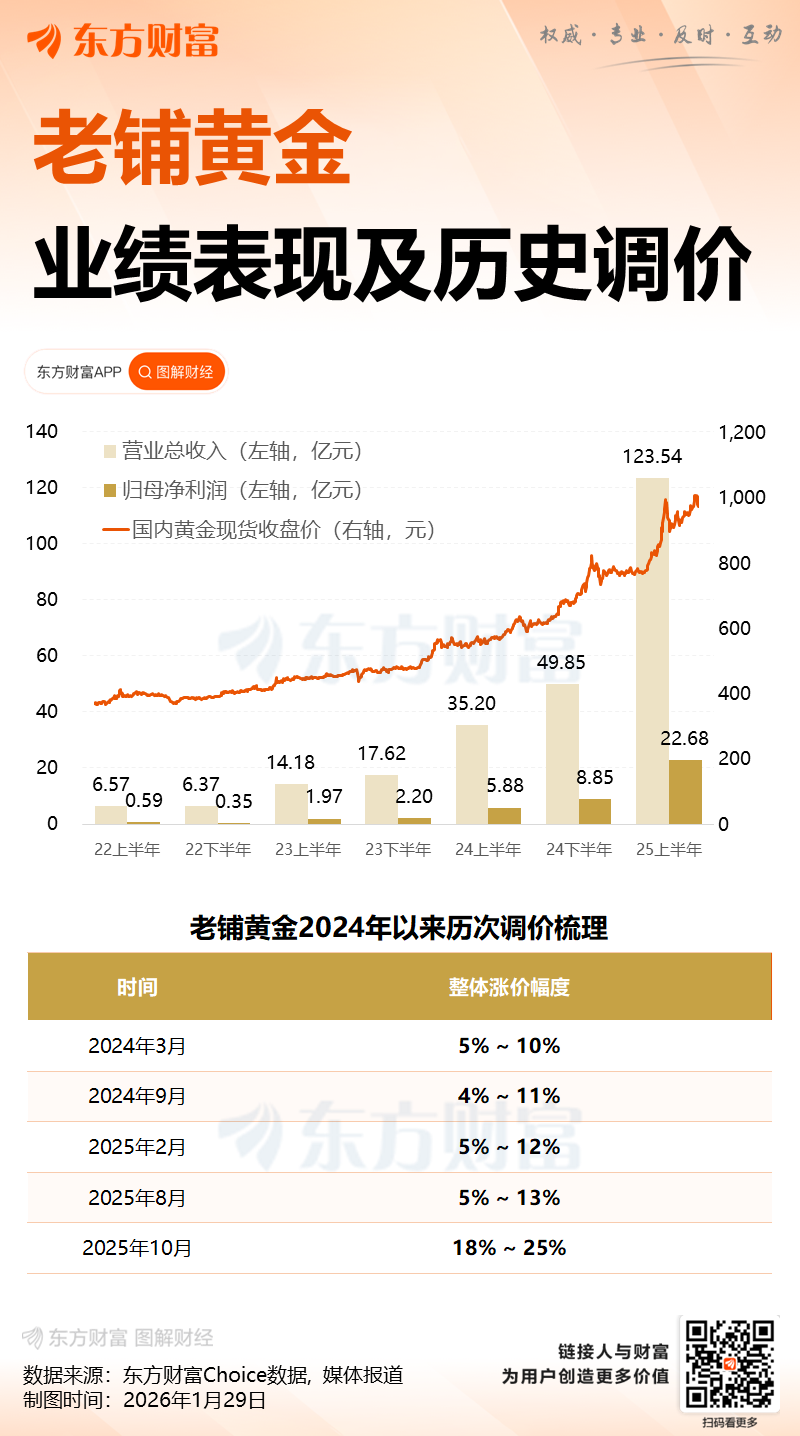 值得注意的是,市场对老铺黄金2月提价的预期强烈。中信建投证券1月25日发布分析报告指出,老铺黄金上次提价在2025年10月17日,当时大盘金价为997元/克,截至2026年1月23日,大盘金价已上涨11.3%,参考周大福同期首饰金价格20.6%的涨幅(从997元/克涨至1542元/克),结合税收新政推高首饰金成本,预计老铺黄金此次提价幅度或达15%-20%。