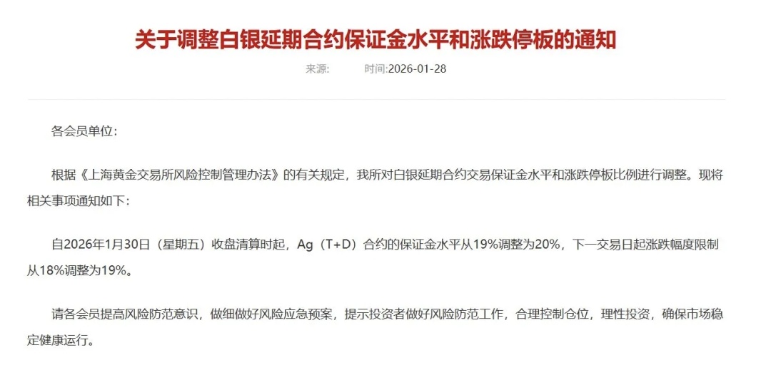 1月28日,上海黄金交易所发布通知,对白银延期合约交易保证金水平和涨跌停板比例进行调整,即自2026年1月30日(星期五)收盘清算时起,Ag(T+D)合约的保证金水平从19%调整为20%,下一交易日起涨跌幅度限制从18%调整为19%。