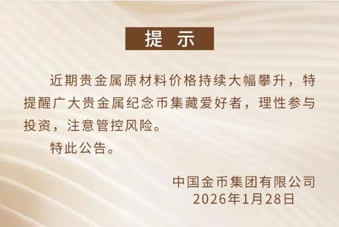 1月28日,中国金币集团有限公司发布重要提示:近期贵金属原材料价格持续大幅攀升,特提醒广大贵金属纪念币集藏爱好者,理性参与投资,注意管控风险。