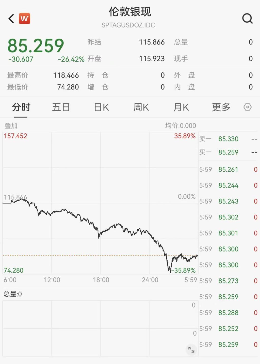 现货白银周五收跌26.42%,创1983年2月28日以来最大单日跌幅,报85.259美元/盎司,脱离1月29日所创历史最高位121.6540美元/盎司,1月份累涨19.12%。。COMEX白银期货周五收盘暴跌25.5%,报85.25美元/盎司,1月份累涨20.10%。