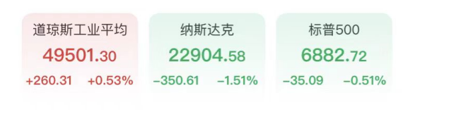周三,受科技股抛售潮加剧影响,纳指标普承压收跌,资金流向工业等板块避险。截至收盘,道指涨260.31点,涨幅0.53%,报49501.30点,纳指跌1.51%,报22904.58点,标普500指数跌0.51%,报6882.72点。