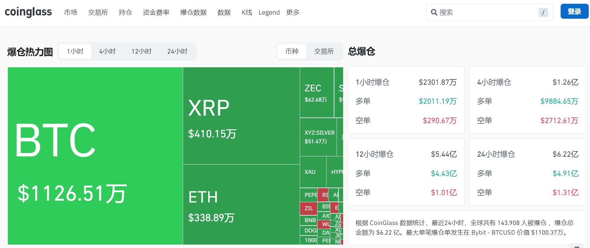据CoinGlass数据统计,最近24小时,全球共有143,908人被爆仓。