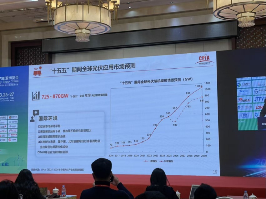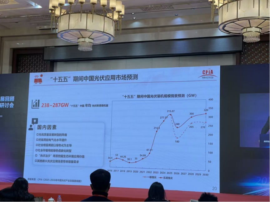 会上发布的路线图预计,2026年中国新增光伏装机规模为180GW至240GW,全球新增光伏装机规模为500GW至667GW。更长时间来看,预计“十五五”期间(即2026年至2030年),中国年均光伏新增装机规模为238GW至287GW,全球年均光伏新增装机规模为725GW至870GW。两个市场的趋势均为2026年回调,此后回归上升通道。