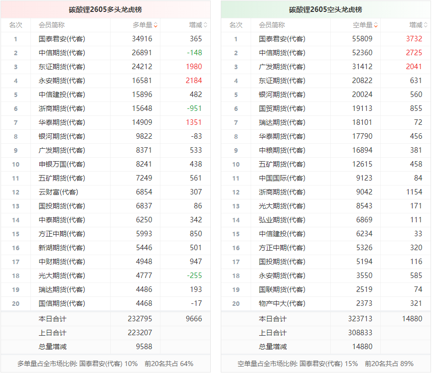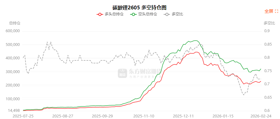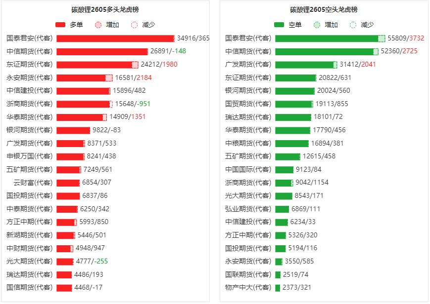 总体而言,碳酸锂2605合约今日增仓上行,多空持仓排名前20席中,多空双方均呈进场态势,多头进场意愿弱于空头。