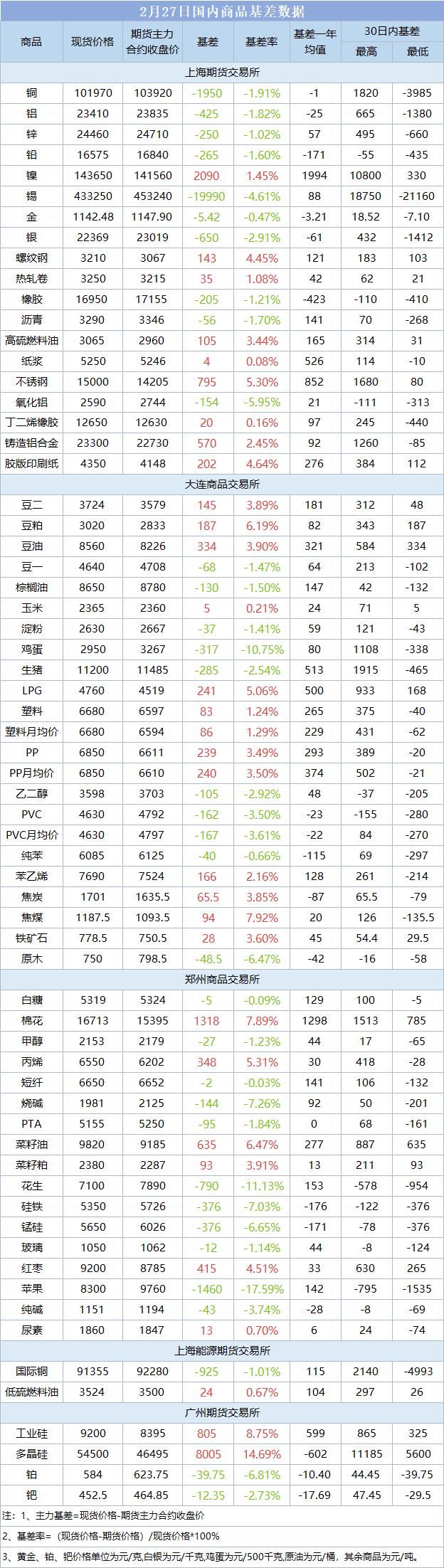 基差报告:2月27日国内商品基差数据一览