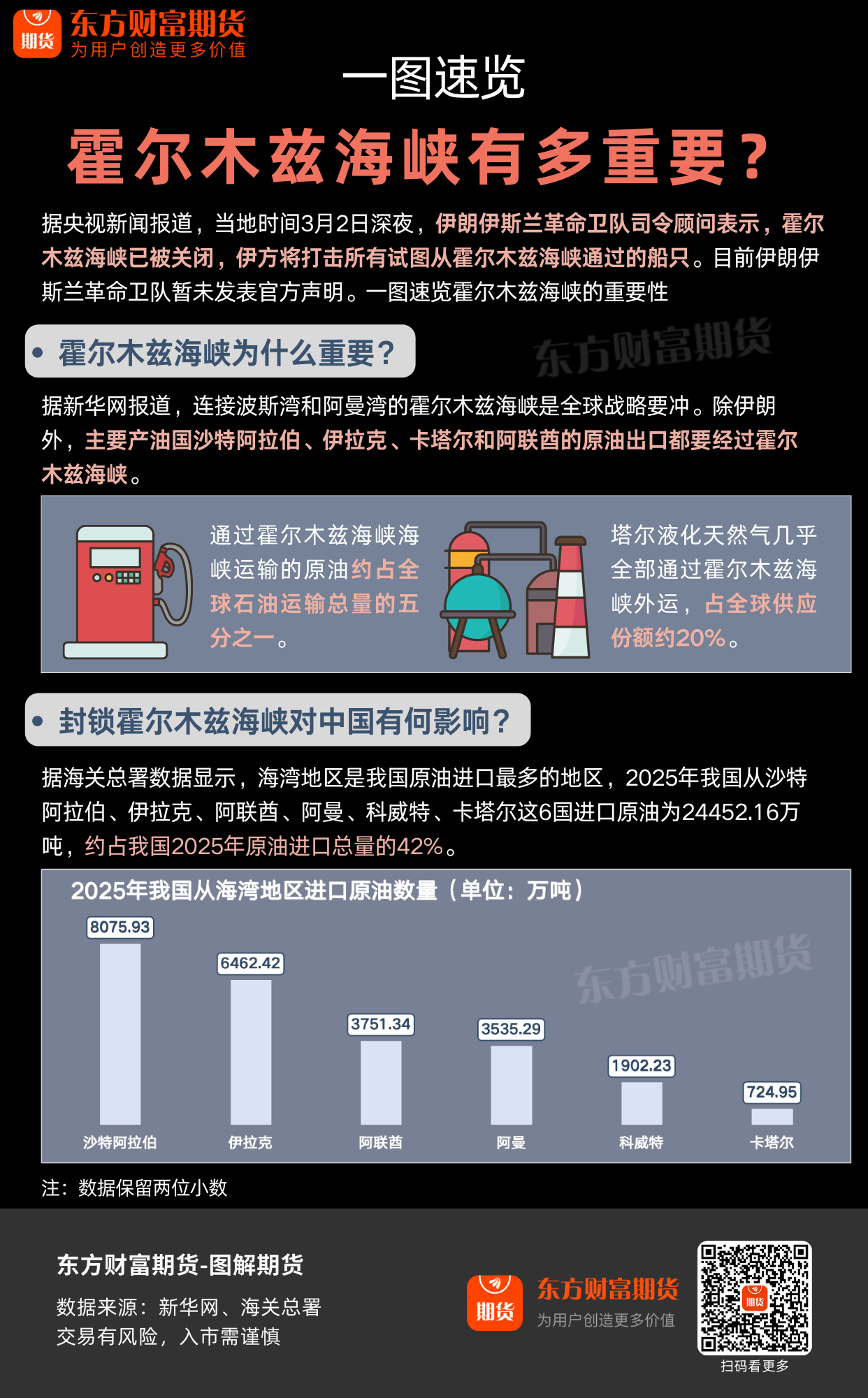 【图解期货 | 霍尔木兹海峡有多重要?】据新华网报道,连接波斯湾和阿曼湾的霍尔木兹海峡是全球战略要冲。除伊朗外,主要产油国沙特阿拉伯、伊拉克、卡塔尔和阿联酋的原油出口都要经过霍尔木兹海峡。