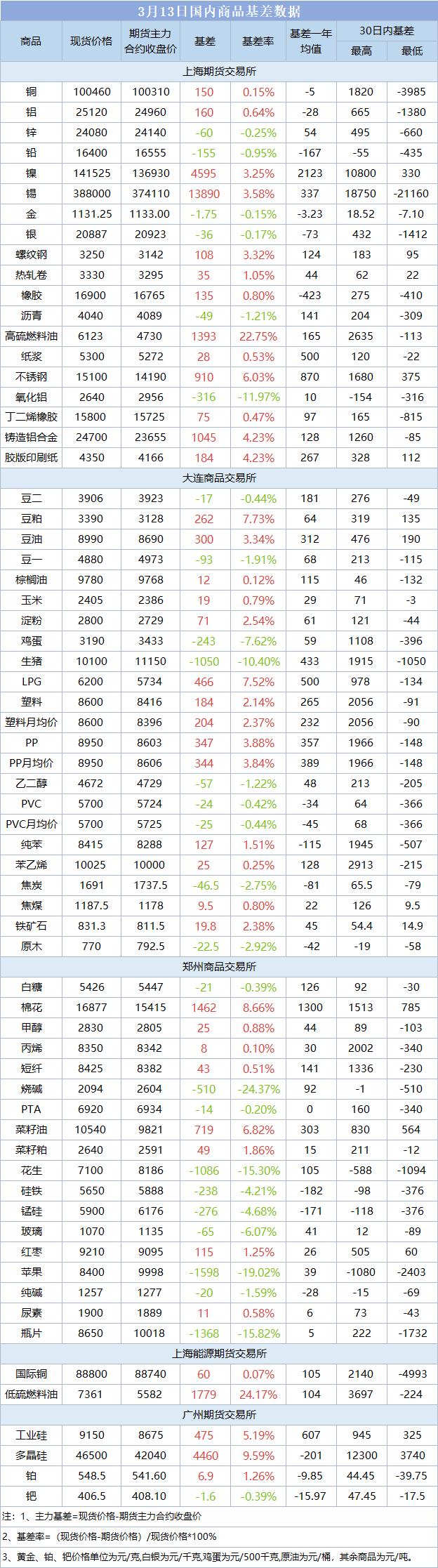 基差报告:3月13日国内商品基差数据一览
