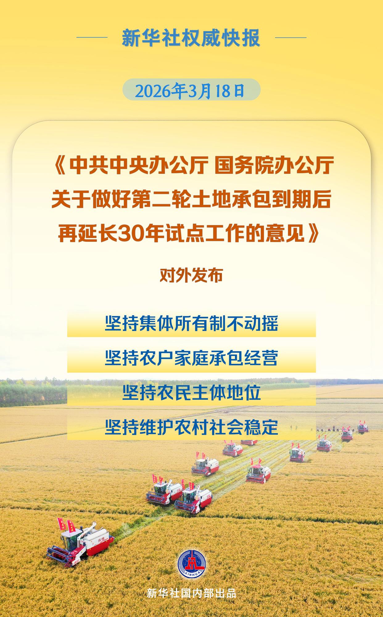 坚持以习近平新时代中国特色社会主义思想为指导,深入贯彻党的二十大和二十届二中、三中全会精神,全面落实习近平总书记关于“三农”工作的重要论述,坚持稳中求进、守正创新,牢牢把住处理好农民和土地关系这条主线,锚定加快建设农业强国目标,坚持把依法维护农民权益作为出发点和落脚点,把强化集体所有制根基、保障和实现农民集体成员权利同激活资源要素统一起来,充分运用农村承包地确权登记颁证成果,通过细致工作有序推进,确保第二轮土地承包到期后再延长30年政策扎实落实到位,不断完善农村承包地所有权、承包权、经营权分置政策体系,进一步巩固和完善农村基本经营制度。