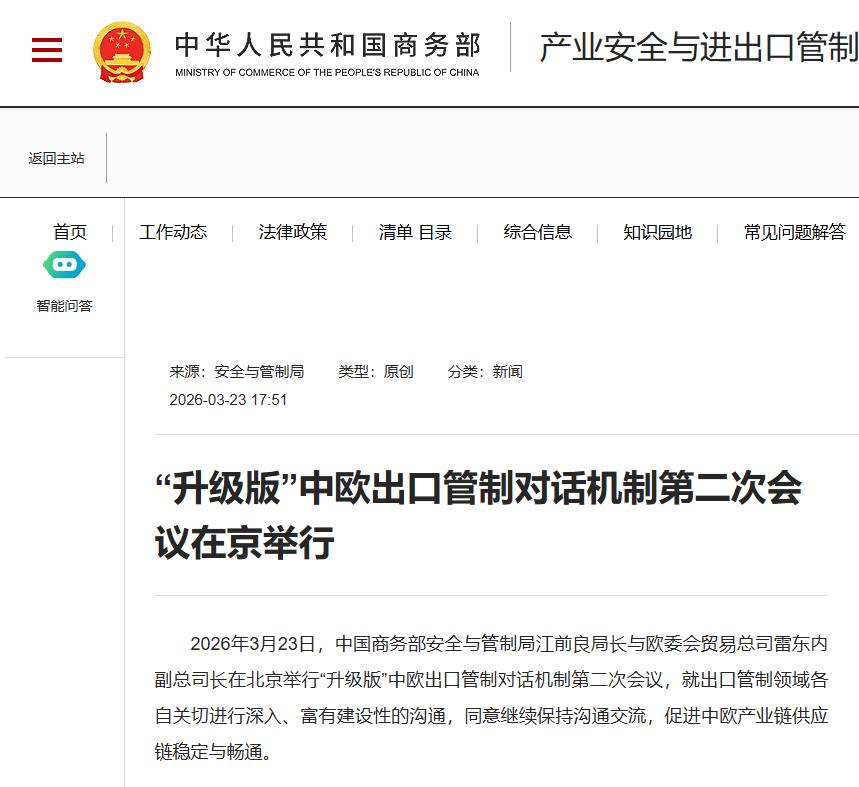 2026年3月23日,中国商务部安全与管制局江前良局长与欧委会贸易总司雷东内副总司长在北京举行“升级版”中欧出口管制对话机制第二次会议,就出口管制领域各自关切进行深入、富有建设性的沟通,同意继续保持沟通交流,促进中欧产业链供应链稳定与畅通。