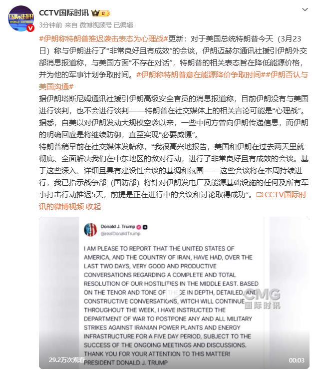 特朗普稍早前在社交媒体发帖称,“我很高兴地报告,美国和伊朗在过去两天里就彻底、全面解决我们在中东地区的敌对行动,进行了非常良好且有成效的会谈。基于这些深入、详细且具有建设性会谈的基调和氛围——这些会谈将在本周持续进行,我已指示战争部(国防部)将针对伊朗发电厂及能源基础设施的任何及所有军事打击行动推迟5天,前提是正在进行中的会议和讨论取得成功”。