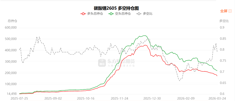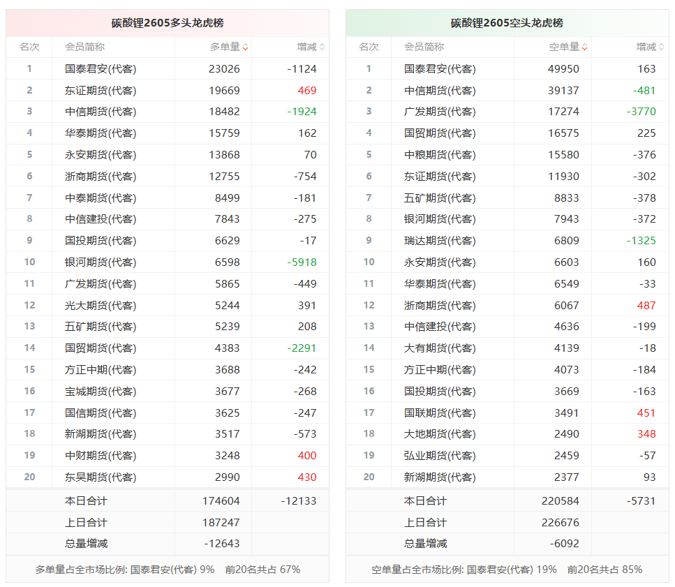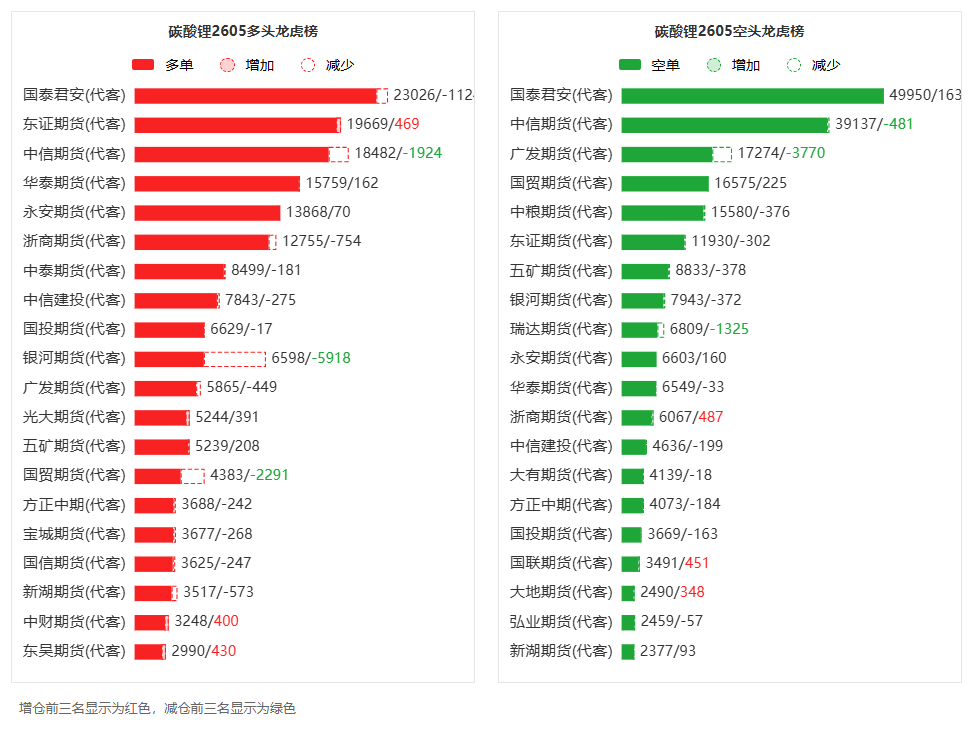 总体而言,碳酸锂2605合约今日减仓上行,多空持仓排名前20席中,多空双方均呈退场态势,多头退场意愿强于空头。