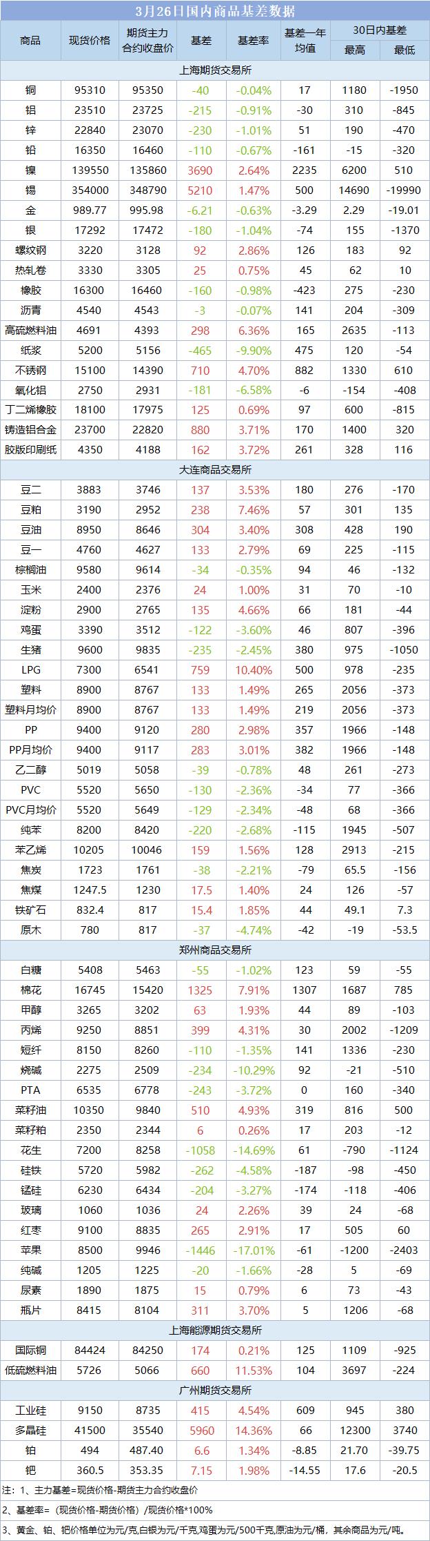 基差报告:3月26日国内商品基差数据一览