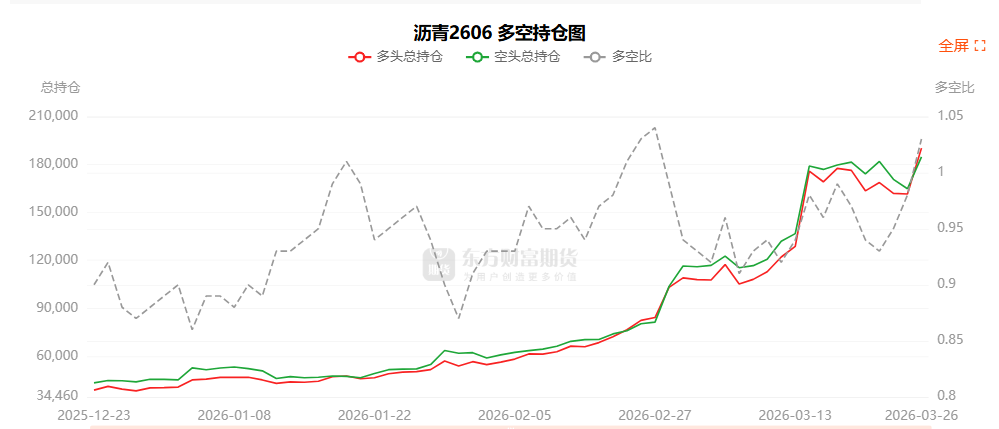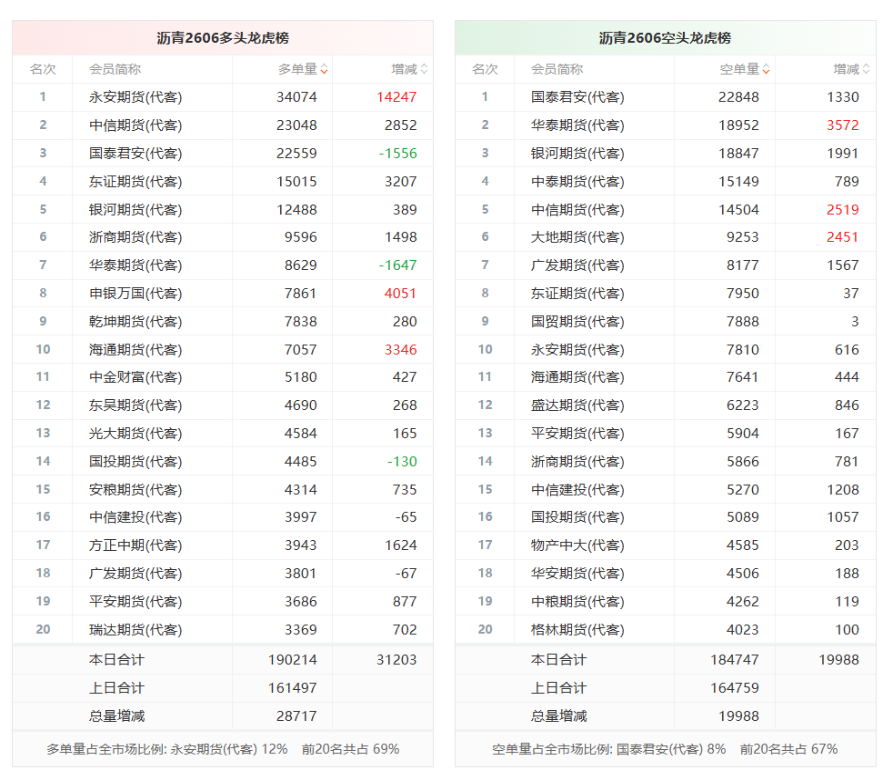 总体而言,沥青2606合约今日增仓上行,多空持仓排名前20席中,多空双方均呈进场态势,多头进场意愿强于空头。