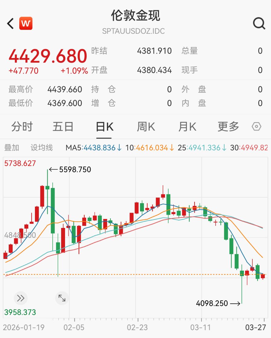 北京时间3月27日,日本遭遇股债双杀,韩国股市一度跌超4%;大宗商品方面,国际原油期价有所回落,现货金银价格略有回升,其中现货黄金一度涨超1%,站上4420美元关口。而昨日(3月26日)受中东局势扰动,市场对通胀担忧情绪影响,现货金银价格大跌。