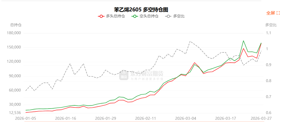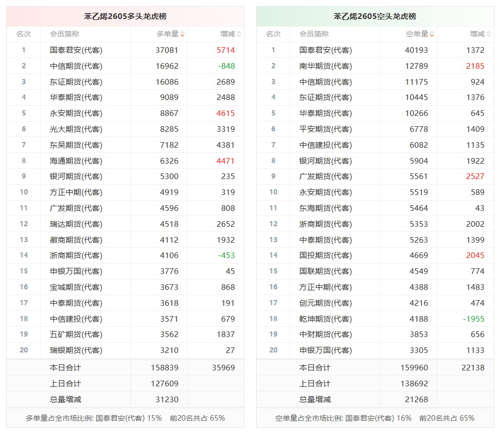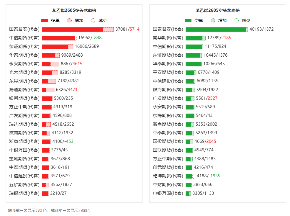 总体而言,苯乙烯2605合约今日增仓上行,多空持仓排名前20席中,多空双方均呈进场态势,多头进场意愿强于空头。
