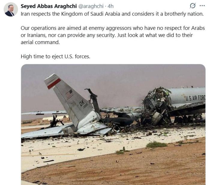 阿拉格齐在帖文中写道,伊朗的行动目标是那些“不尊重阿拉伯人或伊朗人、也无法提供任何安全保障的敌对侵略者,看看我们对其空中指挥系统所做的事情”。