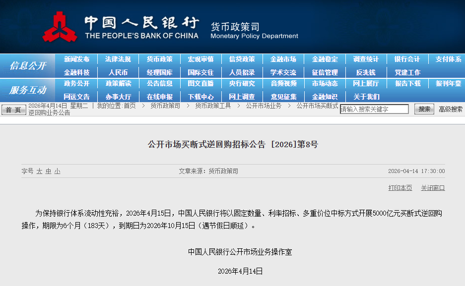 4月14日,中国人民银行发布公开市场买断式逆回购招标公告称,为保持银行体系流动性充裕,2026年4月15日,将以固定数量、利率招标、多重价位中标方式开展5000亿元买断式逆回购操作,期限为6个月(183天),到期日为2026年10月15日(遇节假日顺延)。