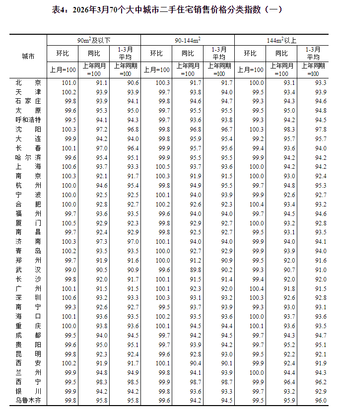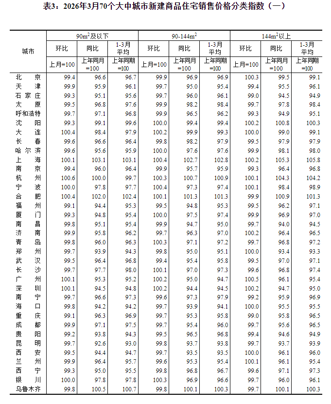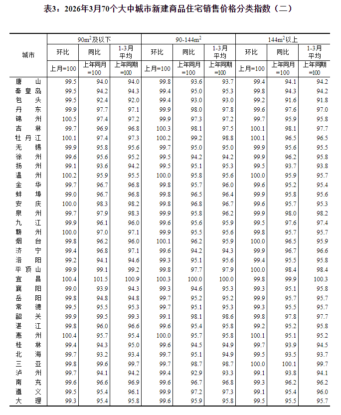 2026年3月份70个大中城市商品住宅销售价格变动情况
