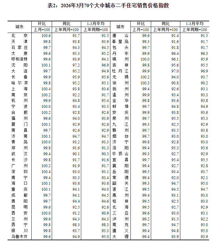 2026年3月份,70个大中城市中,一线城市商品住宅销售价格环比上涨,二三线城市环比降幅收窄或相同。新建商品住宅和二手住宅销售价格环比上涨城市个数均比上月增加。