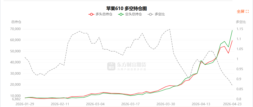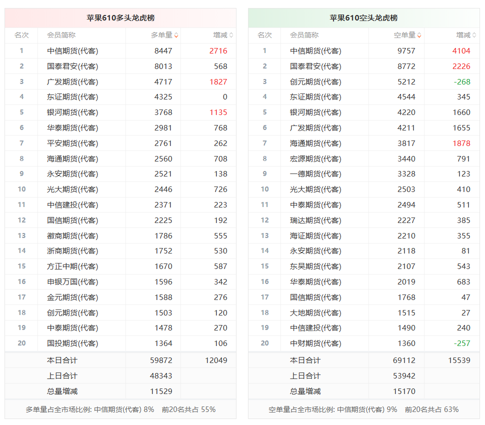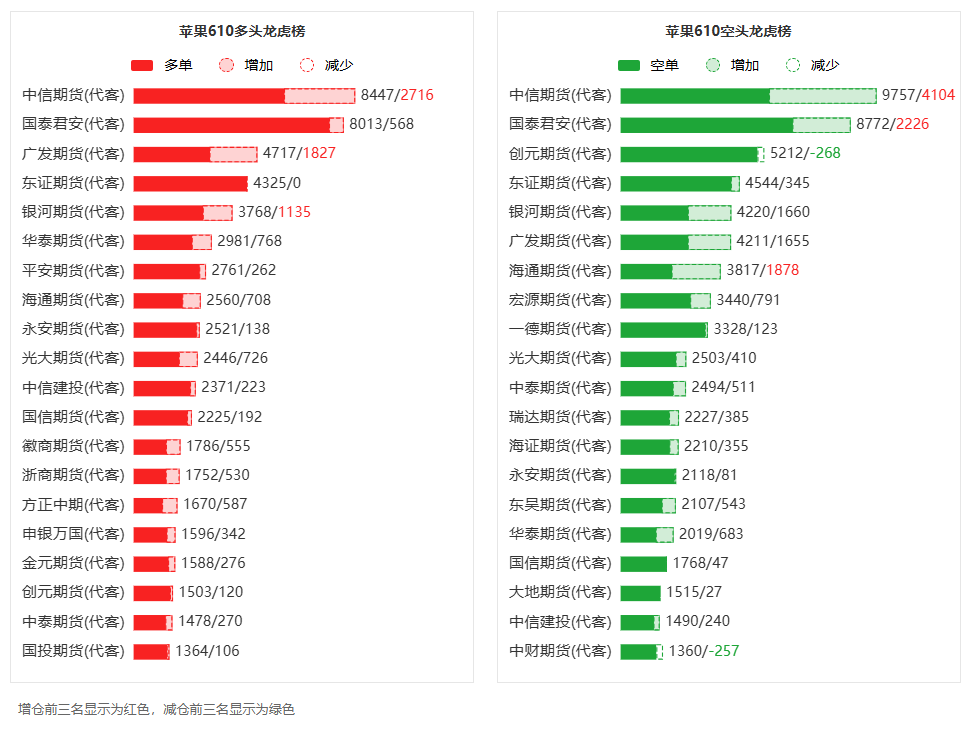 总体而言,苹果610合约今日增仓下行,多空持仓排名前20席中,多空双方均呈进场态势,多头进场意愿弱于空头。