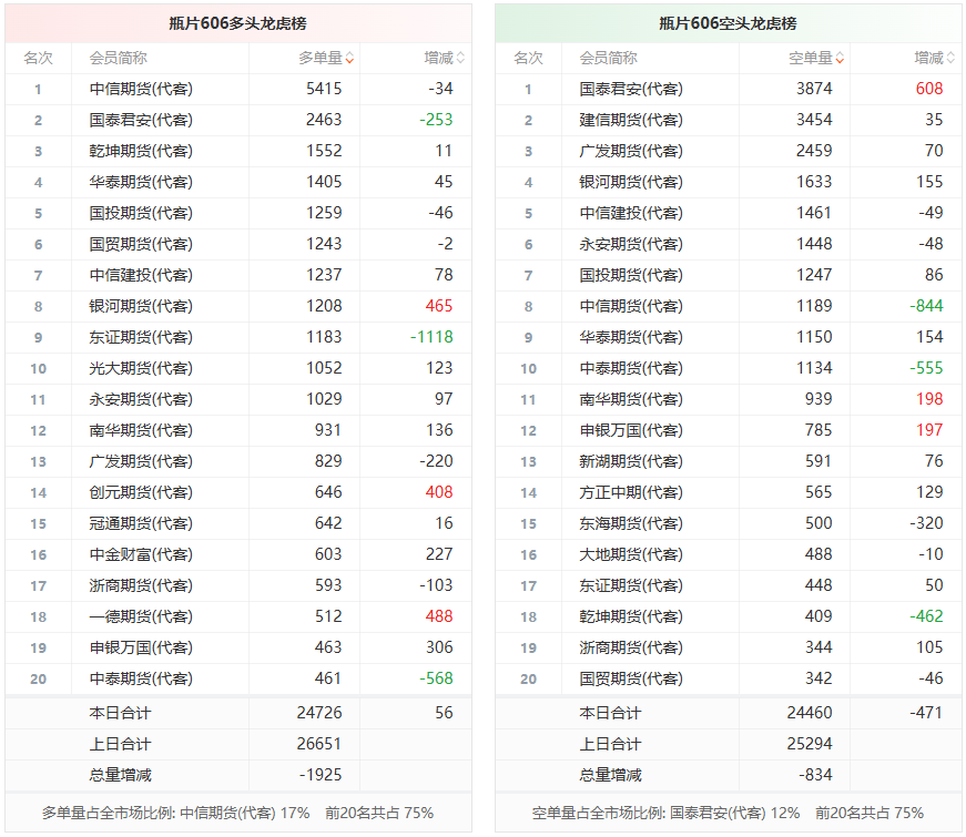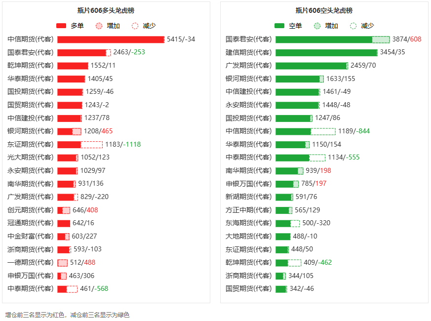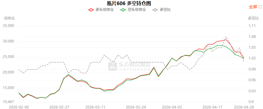 总体而言,瓶片606合约今日增仓上行,多空持仓排名前20席中,多空双方均呈退场态势,多头退场意愿强于空头。