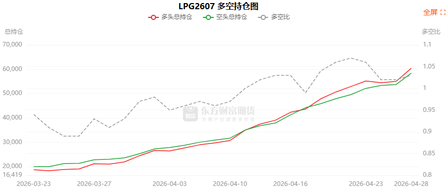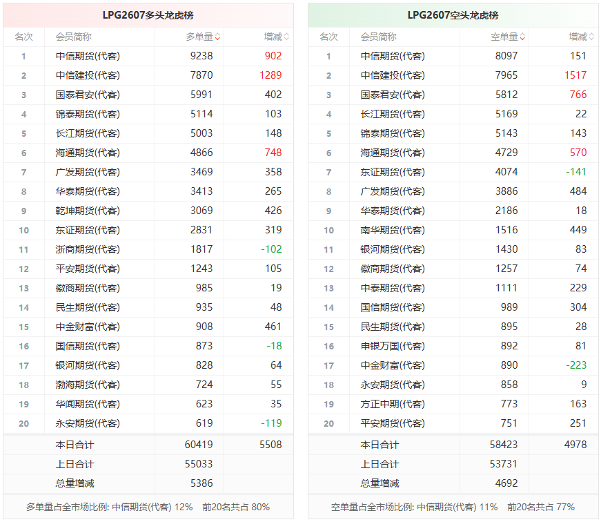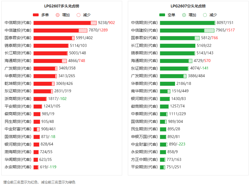 总体而言,LPG2607合约今日增仓上行,多空持仓排名前20席中,多空双方均呈进场态势,多头进场意愿强于空头。