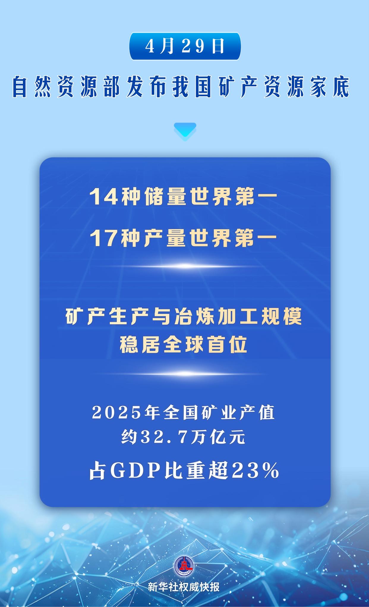 4月29日,自然资源部发布我国最新矿产资源家底。我国稀土、钨、锡、钼、锑、镓、锗、铟、萤石、石墨等14种矿产储量居世界第一。2025年,我国煤炭、钒、钛、锌、稀土、钨、锡、钼、锑、镓、铟、金、碲等17种矿产产量居世界第一。