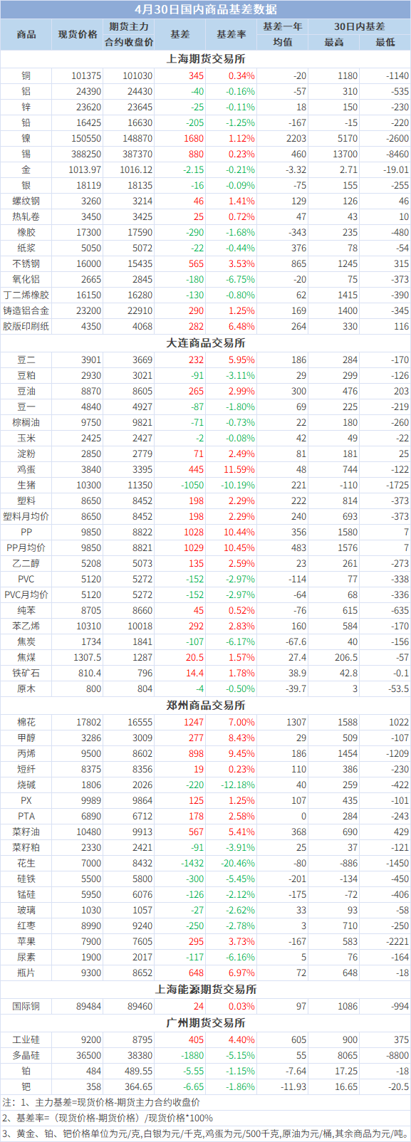 基差报告:4月30日国内商品基差数据一览
